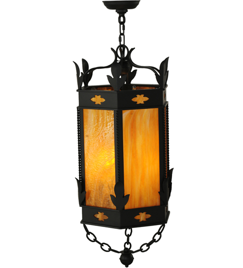 A stunning pendant incorporating a unique Gothic design that beckons with light. Valhalla features a decorative lantern that reveals Honey Ripple Glass which is complemented with hardware in a Blackwash finish. The decorative frame and hardware shown in a matching finish, are embellished with decorative accents and shield medallions. Handcrafted by highly skilled artisans in Yorkville, New York, this striking fixture is offered in custom styles, colors and sizes are available. Energy efficient lamping options such as LED are available. The 14-inch wide fixture is UL and cUL listed for damp and dry locations.