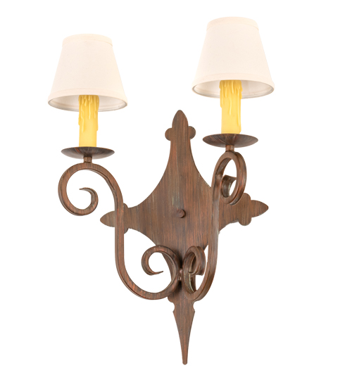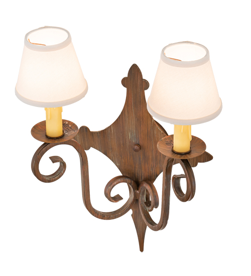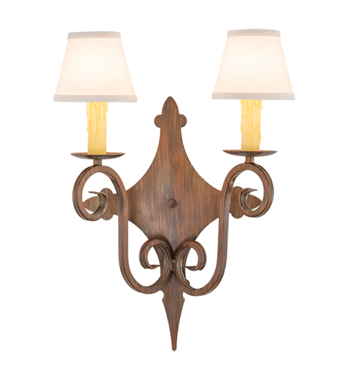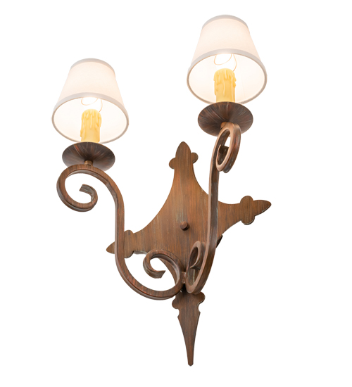 Rich charm and elegance come to light with Angelique. This 2-light wall sconce is designed as a dramatic accent for a hallway, entryway or any other room. The enchanting wall fixture features Ivory faux candlelights crowned with Natural Linen Shades. The shades are perched on bobeches, with Hand Forged Iron scrolled arms and stylized diamond shaped hardware featured in an Old Red Barn finish. Handcrafted by highly skilled artisans in our 180,000 square foot manufacturing facility in Yorkville, NY. Available in custom sizes, shade colors, and finishes. UL and cUL listed for dry and damp locations; however, we do not recommend installing it in spaces that experience a large amount of moisture due to the fabric shades.