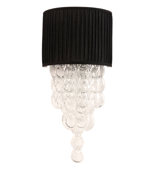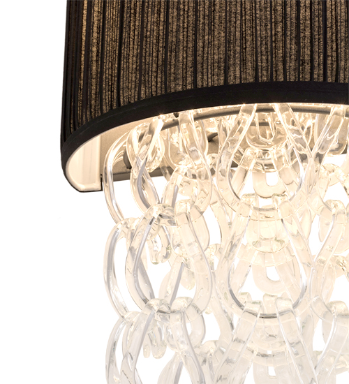 Evoking an elegant transitional look, this Lucy wall sconce features uniquely formed Clear Glass hoops custom crafted and interlocked into an enticing, intricate design. The fixture reveals a curved Black Pleated Textrene shade which is enhanced with Blackened Pewter finished hardware. The sconce is handcrafted in the USA and available in custom sizes, colors and styles. Dimmable energy efficient lamping options such as LED are available. The fixture is UL and cUL listed for damp and dry locations.