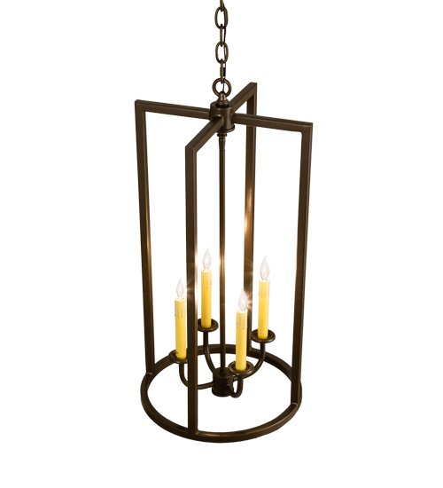 Porte Tournante features a classic open frame lighting design. The pendant offers an appealing profile and delivers beautiful ambient illumination from four customer supplied Ivory faux candlelights. The hardware is featured in a Brown Metallic finish. Overall height ranges from 35 to 58 as the chain can be easily adjusted in the field. Made to Order in our 180,000 square foot US manufacturing facility in Yorkville, NY. Custom sizes, metal finishes, and faux candlelight colors are offered. UL and cUL listed for dry and damp locations.
