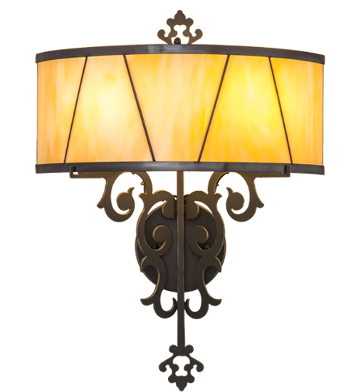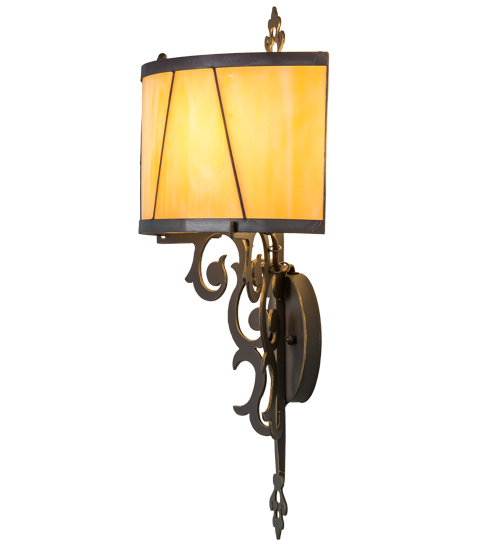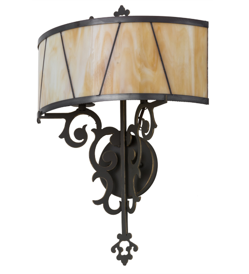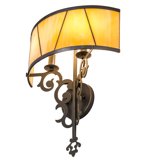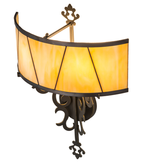 Rich styling and elegance come to light with Aneila. This wall sconce pairs curved Beige art glass with detailed scrolled hardware and decorative elements that are featured in a Timeless Bronze with Highlights finish. Handcrafted in the USA, this exquisite fixture is available in custom sizes, styles and colors. Dimmable energy efficient lamping options are available. UL and cUL listed for damp and dry locations