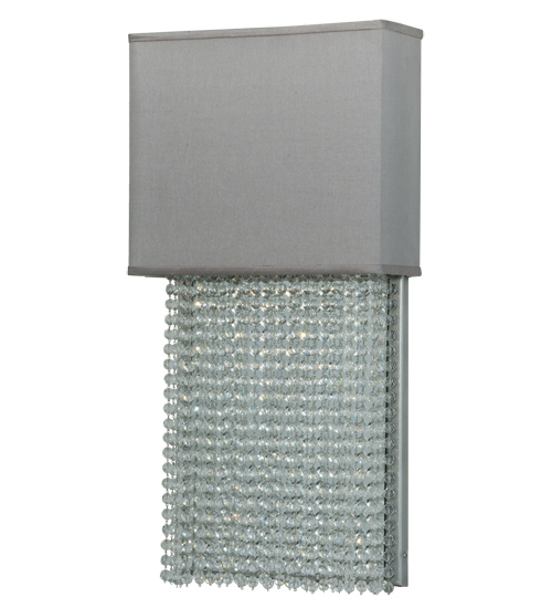 Like the rapid flow of a waterfall, exquisite strands of crystal beads drape under a Pebble Textrene Shade. This transitional wall sconce combines the elegance of crystal with the casual sophistication of fabric. The steel hardware and backplate are featured in a Pewter finish. Custom options include special sizes, designs, finishes and dimmable energy efficient lamping options such as LED. The fixture is UL and cUL listed for damp and dry locations.