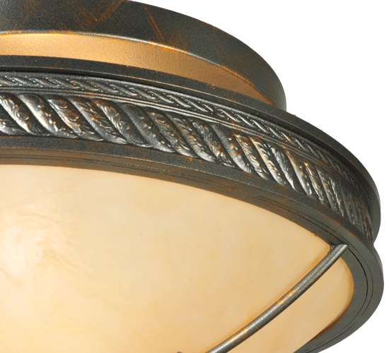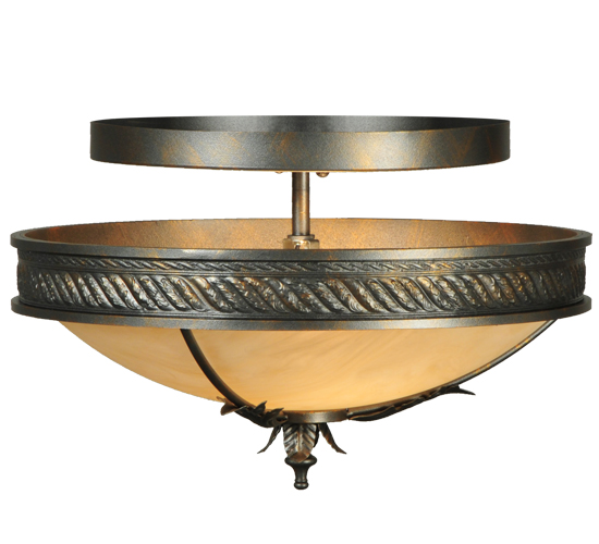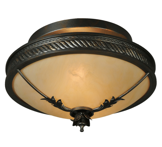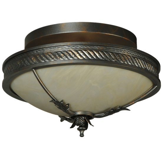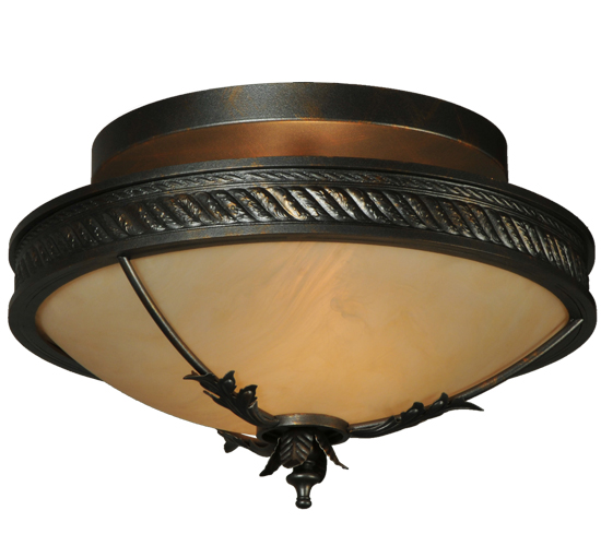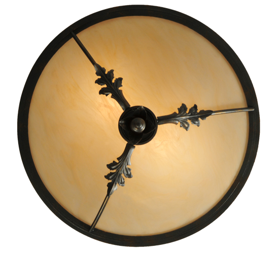 The Hoja ceiling fixture is adorned with metal accents that replicate Acanthus leaves in a French Bronze finish. This contoured ceiling fixture features a Sahara Taupe Idalight shade with decorative trim, finial and matching hardware. This fixture is ideal for a variety of spaces in fine residential, hospitality and commercial settings. Handcrafted by highly skilled artisans in our 180,000 square foot manufacturing facility in Yorkville, New York. Lens colors, metal finishes and sizes can be customized to meet your needs. UL and cUL listed for damp and dry locations.