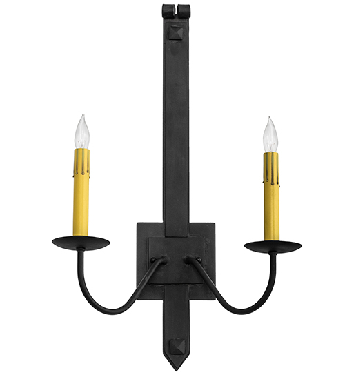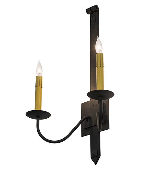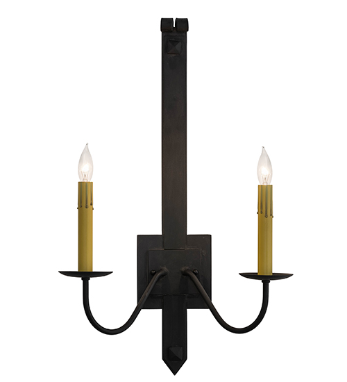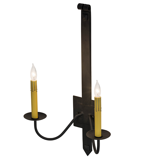 Rustic minimalism with a touch of elegance. An appealing glow is cast from these two faux candlelights which adorn a uniquely primitive styled wall plate and hardware featured in a Costello Black finish. Our lighting fixtures are offered with multiple candlelights as well, and in a variety of custom sizes, finishes and styles. Custom crafted by highly skilled artisans in our 180,000 square foot manufacturing facility in Yorkville, New York. This fixture is available in custom sizes, styles, colors and energy-efficient lamping options. UL and cUL listed for damp and dry locations.