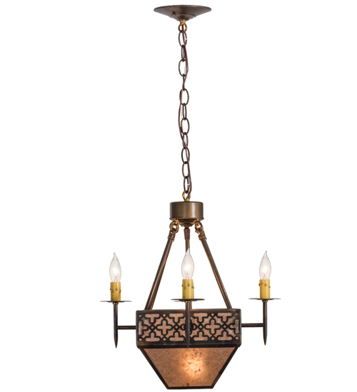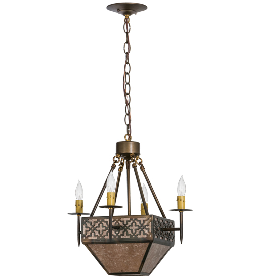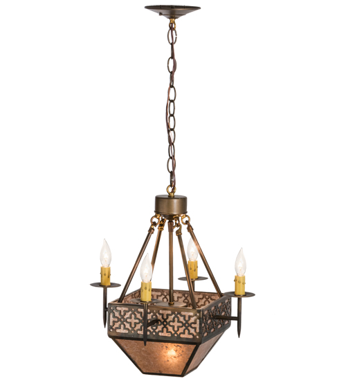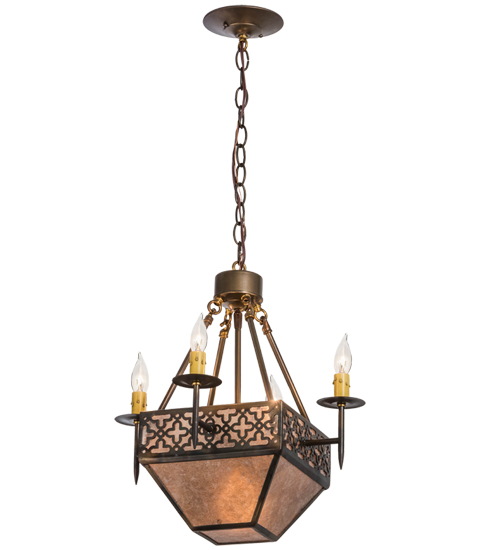 A handsome Craftsman style pendant offers Rustic elegance. The inverted Silver Mica Shade features stylized crosses and matching hardware in a Light Burnished Antique Copper finish. Four Ivory faux candlelights provide beautiful ambient illumination. The overall height ranges from 20 to 96 inches as the chain length can be easily adjusted in the field.The Gironde Pendant is Domestically Produced in the USA at our Yorkville, NY manufacturing facility.Customize the shade colors, metal finishes and pendant sizes to meet your preferences. UL and cUL listed for damp and dry locations.