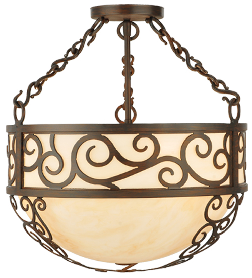 A touch of warm opulence is blended with elegant scrolled metalwork that evokes a handcrafted look. This ceiling fixture offers a lovely transitional style featuring stunning Sahara Taupe Idalight. The diffuser is complemented with a warm Rustic Iron finish. Custom crafted in our 180,000 square foot manufacturing facility in Yorkville, New York. Lens colors, metal finishes and fixture sizes can be customized to your needs. UL and cUL listed for dry and damp locations.
