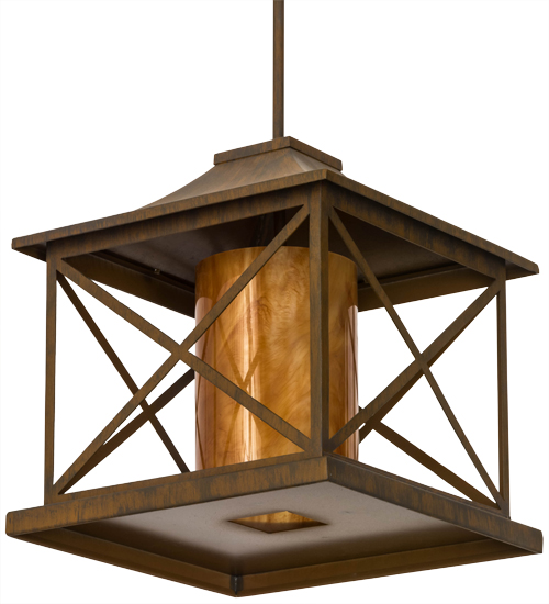 A charming aura projects from an Ambra Siena Idalight cylindrical diffuser which is complemented with a Rustic Iron frame and hardware highlighted with Saltire motifs. The metal bottom is hinged for re-lamping and features a 3-inch aperture for downlighting. Handcrafted in the USA. The handsome pendant is offered in custom sizes, designs and colors, as well as dimmable energy efficient light source options such as LED. This 16-inch wide fixture is UL and cUL listed for dry and damp locations.