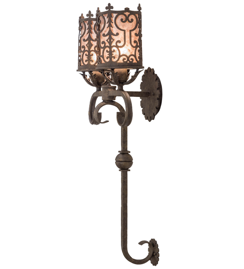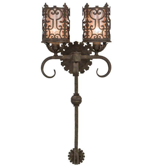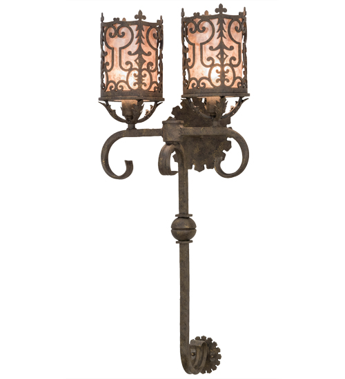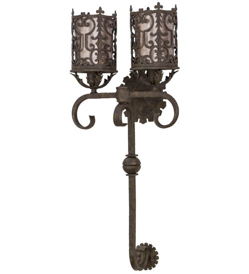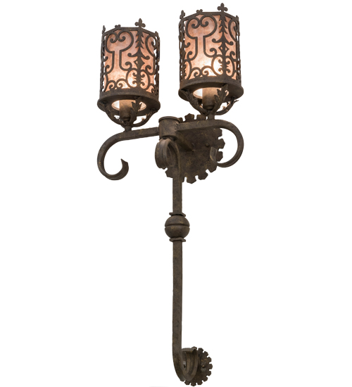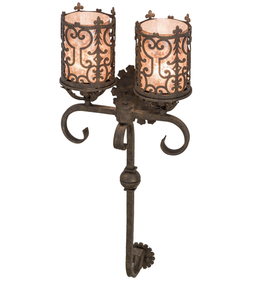 A gracious blend of opulence and regal panache come to light with Oskar which features Gothic styled metalwork, fanciful swirls, scrolled accents and a curved arm. This exceptional lighting fixture highlights a stylish elegance with an ornate decorative frame in a stunning Antiquity finish that reveals two Silver Mica diffusers. Custom crafted in the USA, this wall sconce is available in custom designs, colors and sizes. Dimmable energy efficient lamping options such as LED are available. The two-light wall luminaire is UL and cUL listed for damp and dry locations.