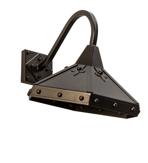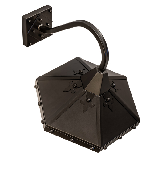 Designed for both interior and exterior lighting applications. This handsome wall sconce features decorative accents inspired by an inverted Fleur-de-lis and bold round rivets for a unique industrial look. The shade is embraced by a gooseneck arm which is finished in an Exterior Oil Rubbed Bronze. The Mystic Wall Sconce is Domestically Produced in the USA in our 180,000 sq ft manufacturing facility at our Yorkville, NYmanufacturing facility. Customize shade colors, metal finishes and fixture sizes. UL and cUL listed for dry, damp and wet locations.