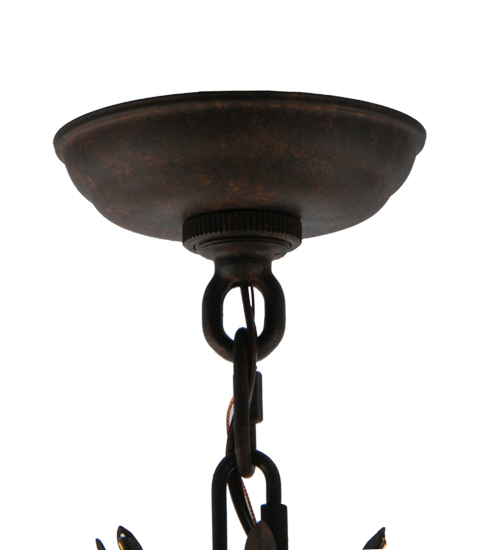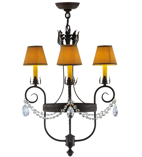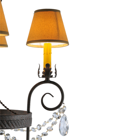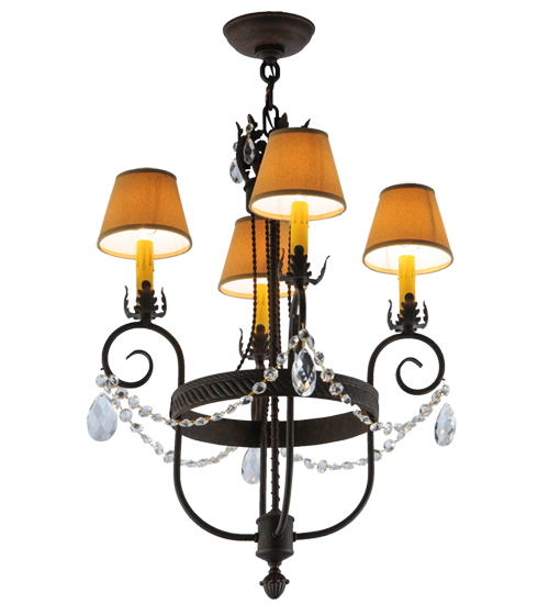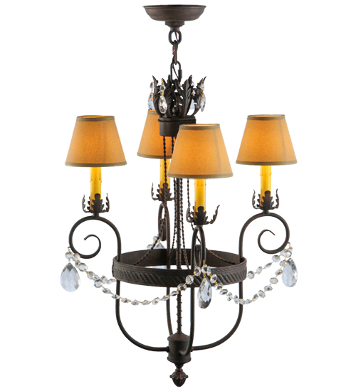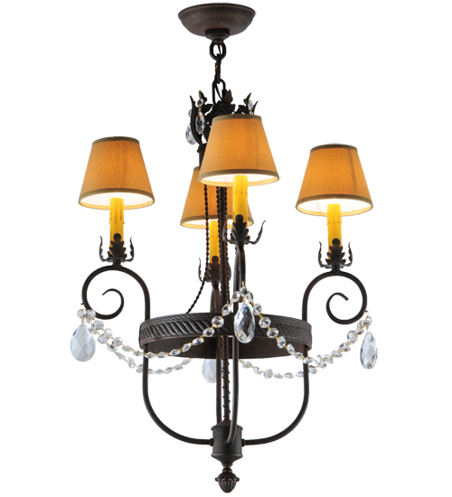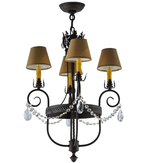 Exquisite styling and luxurious charm are reflected in this 4-light chandelier. This elegant Antonia Chandelier embraces 4 Amber faux candlelights which are crowned with Parchment shades (an old photo update written calls these Tuscan Alabaster shades) and enhanced with faceted crystal charms, scroll arms, an Acanthus leaf accents and rich Cajun Spice finished hand-forged hardware. This chandelier features quality materials and hand detailed American craftsmanship perfected by years of time honored artistry, passed down from generations of highly skilled artisans. Custom sizes, styles, colors and dimmable energy efficient lamping options such as LED are available. The fixture is UL and cUL listed for damp and dry locations.