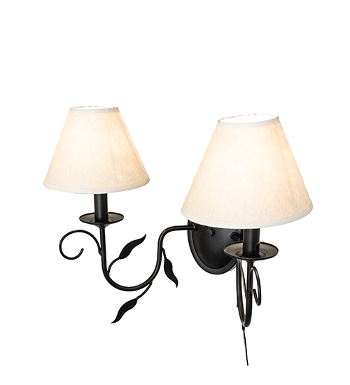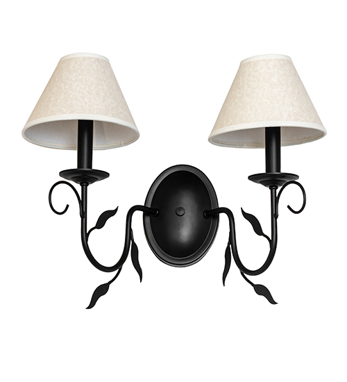 Offering luxurious charm and elegance, Bordeaux features two Handpainted Blackwash faux candlelights crowned by Ivory Textrene shades that are perched on complementary bobeches. The Scrolled arms and Leaf accents match the Blackwash finished hardware. Custom crafted in the USA, this wall sconce is available in custom sizes, styles and colors, as well as dimmable energy efficient lamping options. This 18-inch wide wall fixture is UL and cUL listed for dry and damp locations; however we do not recommend installing it in spaces that experience a large amount of moisture.