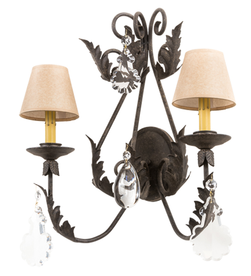 A luxurious wall sconce design comes to light with elegance and glamour. Two Ivory faux candlelights crowned with Taos Textrene shades are perched on bobeches, which are embraced by exquisite acanthus leaf accented arms and accented with decorative scrollwork and crystal pendalogues. The decorative accents, frame and hardware are featured in an Antiquity finish. This lovely wall fixture is handcrafted in our 180,000 square foot manufacturing facility in Yorkville, New York. Shades styles and metal finishes can be customized to your needs. UL and cUL listed for dry and damp locations, however, we do not recommend installing it in spaces that experience a large amount of moisture due to the fabric shades.