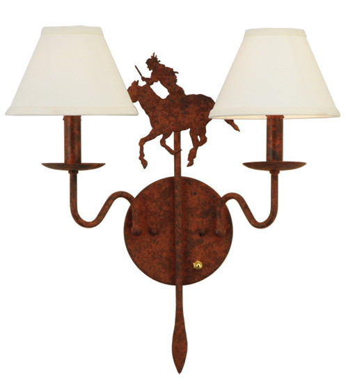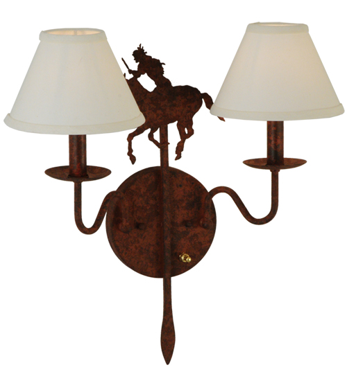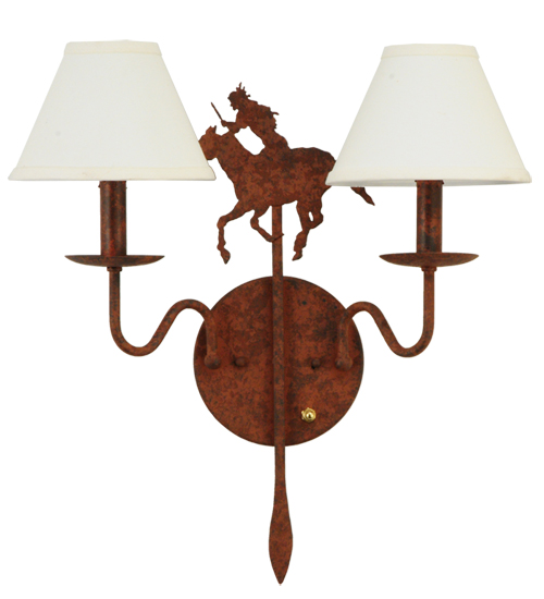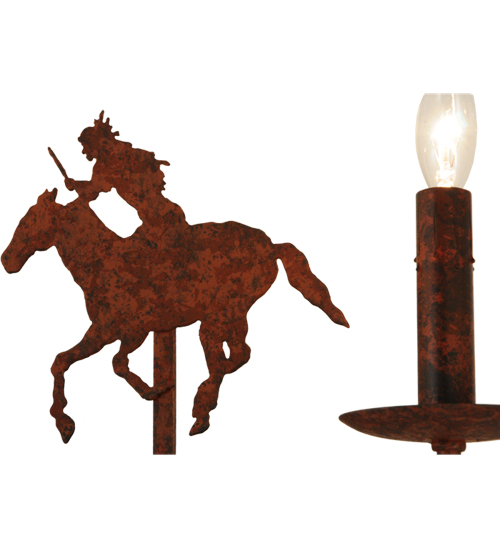 Running wild and free into the sunset, this Native American Brave is shown galloping on his trusted horse. The metal figure is flanked by two Natural Linen Shades perched on complementary faux candlelights. The fixture is enhanced with a Rusty Nail finish. This exquisite Brave’s Run Wall Sconce is Domestically produced in our 180, 000 square foot manufacturing facility in Yorkville, New York. Customize diffuser colors, metal finishes and fixture sizes to your preference. UL and cUL listed for dry and damp locations, however we do not recommend installing it in spaces that experience a large amount of moisture due to the fabric shades.