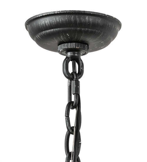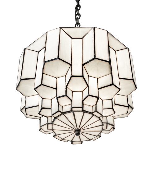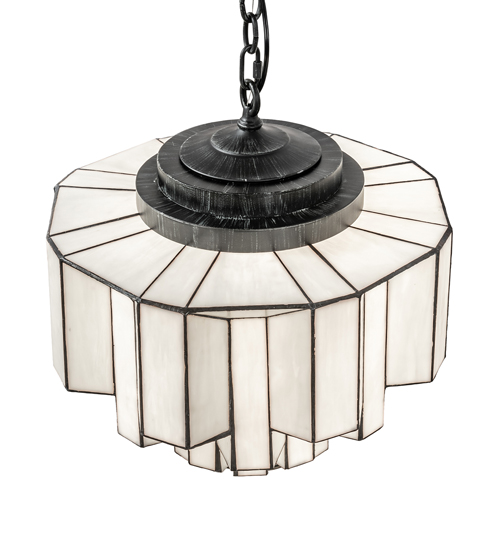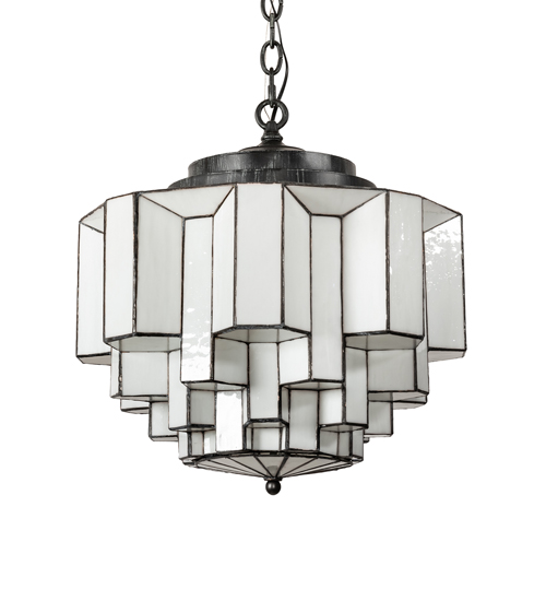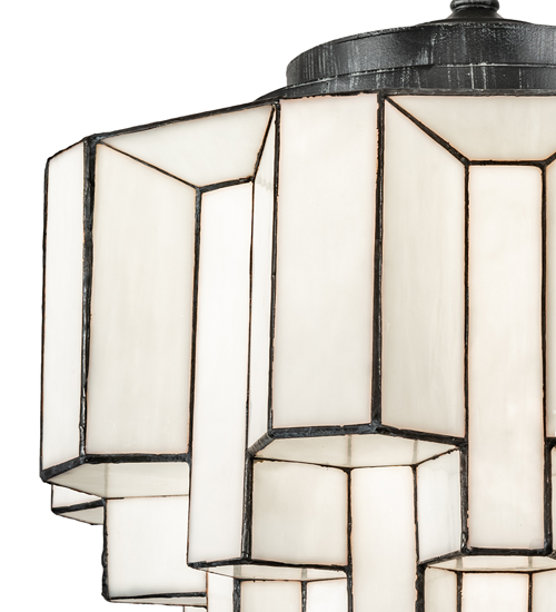 Designed with the glitz and glam of old fashioned movie theaters. Paramount evokes a romantic allusion with a dramatic lighting design that features White Art Glass created using the famous copperfoil construction. Multi layers and levels of enclosed glass towers project an extraordinary dimensional effect. The pendant features an Antique Iron Gate finish. The overall height ranges from 23 to 52 inches as the chain length can be easily adjusted in the field to accommodate your specific lighting needs. Shade colors, metal finishes and fixture sizes can be customized to your needs. UL and cUL listed for dry and damp locations.