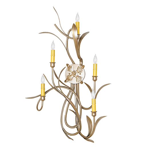 The Roselle Wall Sconce defines unsurpassed elegance, grace, and beauty with a shapely floral-inspired frame and hardware in an exquisite Champagne Metallic finish, Hand-Forged Iron Arms, and Willow Leaf metal accents complement five Ivory faux candlelights, creating beautiful ambient illumination. The luxurious wall luminaire will add sophisticated sparkle and romantic charm to any room and is ideal for illuminating walls in fine homes and hotels. The Roselle 5 Light Wall Sconce is included in our American-made, American-designed, handcrafted Nature Inspired Lighting Collection and manufactured in Yorkville, New York. The fixture is UL and cUL listed for dry and damp locations.
