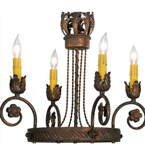 Exquisite styling and luxurious charm are reflected in the faceted crystal charms, scroll arms of the Antonia chandelier, which is complemented with Acanthus leaves and rich Gilded Tobacco finished hardware. This elegant fixture embraces 4 Amber faux candlelights in floral styled bobeches. This chandelier features quality materials and hand detailed American craftsmanship perfected by years of time honored artistry and passed down from generations of skilled artisans. Custom sizes, styles, colors and dimmable energy efficient lamping options such as LED are available. The fixture is UL and cUL listed for damp and dry locations.