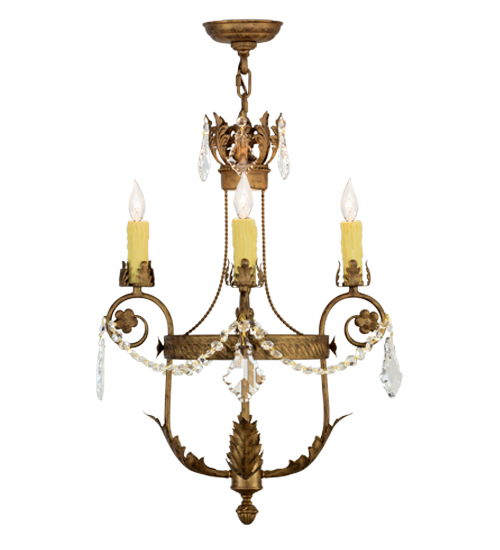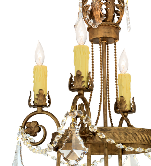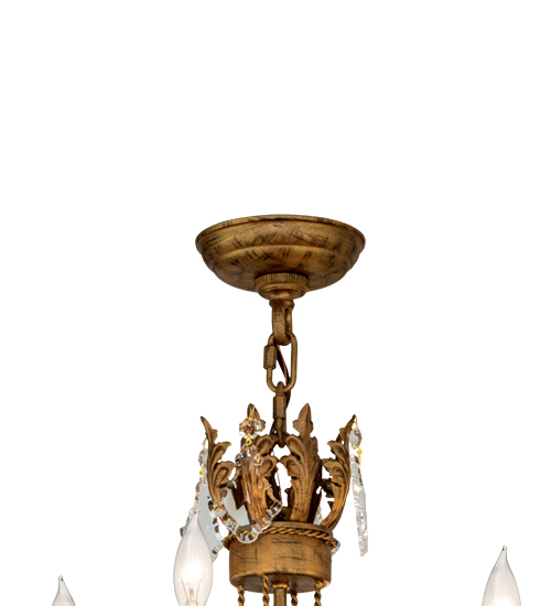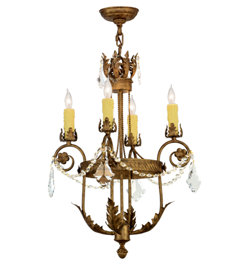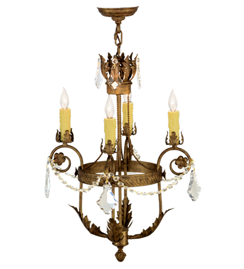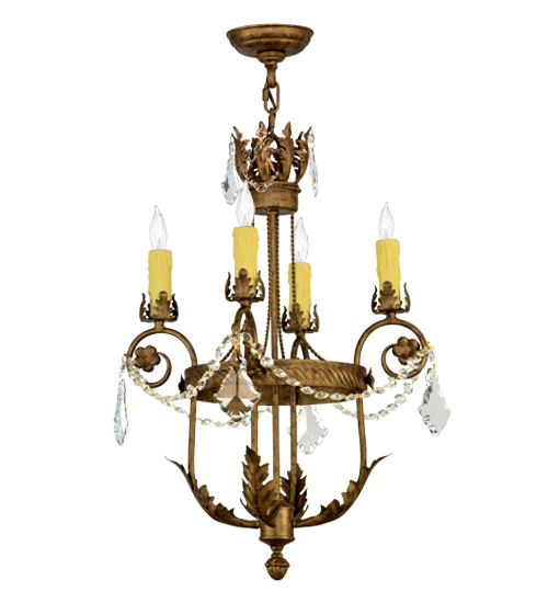 Exquisite styling and luxurious charm are reflected in the Antonia Chandelier, which is adorned with 4 Amber faux candlelights. The decorative accents, frame and Hand-Forged Iron Hardware are featured in a Spanish Gold finish. The fixture is enhanced with floral bobeches, Acanthus leaves and Crystal beads and droplet accents and features quality materials and hand detailed American craftsmanship perfected by years of time honored artistry, passed down from generations of highly skilled artisans. Custom sizes, styles, colors and dimmable energy efficient lamping options such as LED are available. The fixture is UL and cUL listed for damp and dry locations.