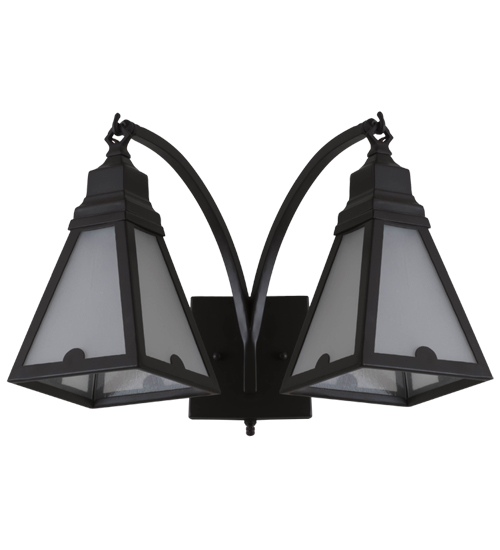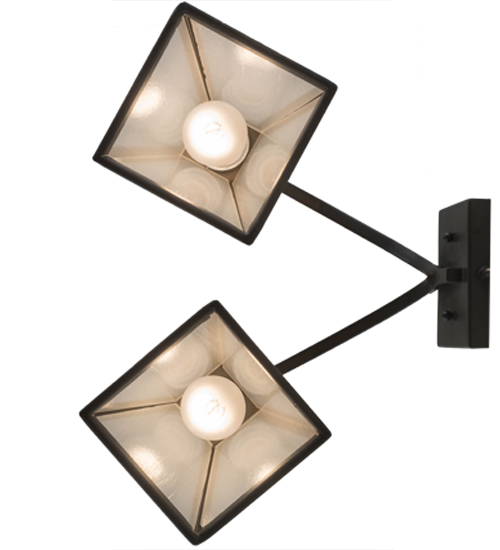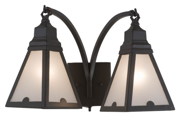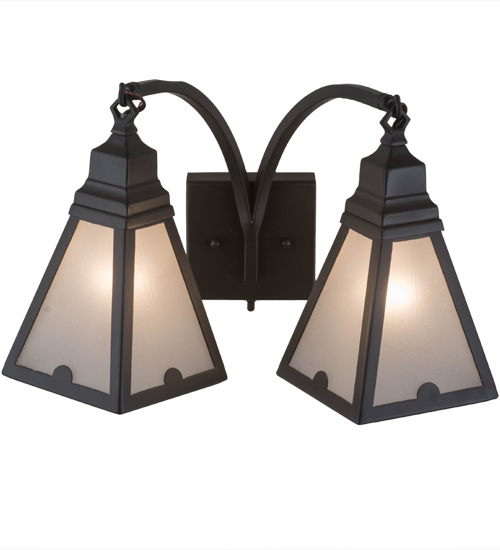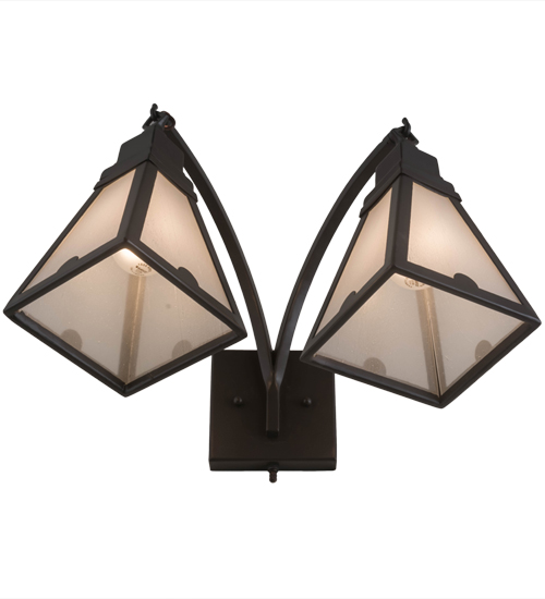 The Armage wall sconce features twin Craftsman styled shades, which are adorned with unique, diminutive arc-shaped accents, feature Frosted Seeded Glass to diffuse the light beautifully. The frame, curved arms and hardware are offered in a Timeless Bronze finish. This fixture is handcrafted in the USA and is available in custom sizes, configurations, styles and finishes. Dimmable energy efficient lamping options, such as LED, are available. The sconce is UL and cUL listed for damp and dry locations.