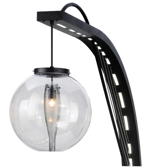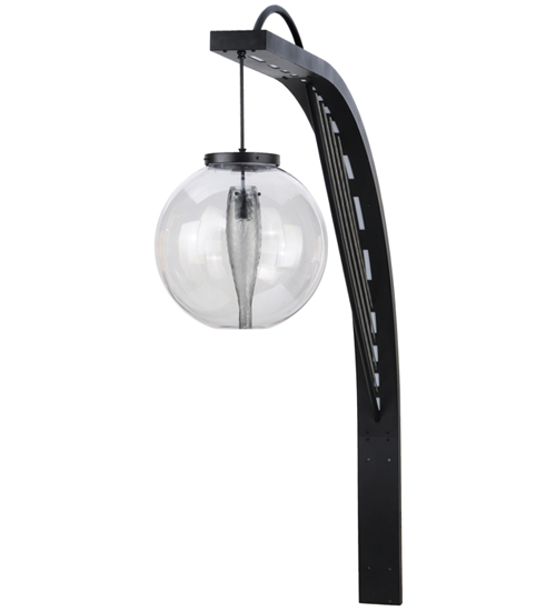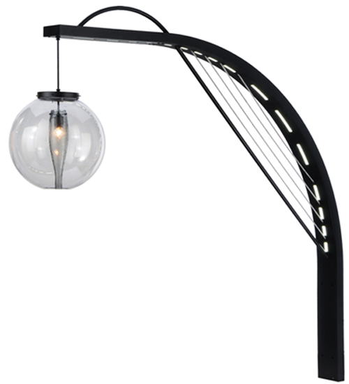 Bold, eyecatching appeal integrates urban modernism with industrial utilitarianism. Innovative wall luminaire features a curvilinear Idalight diffuser designed to house custom lighting elements with inverted wine bottles and cylinders. A towering arc styled support with solid steel harp in striking Black Texture finish illuminates with advanced LED technology. Wet list for outdoor and indoor applications.