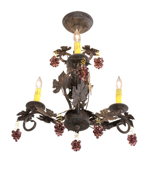 Elegant charm is revealed with this nature inspired design as artistic clusters of grapes and vine leaves adorn this stunning chandelier. The grape accents are featured in crystal while the metal leaf designs and hardware are offered in a warm Coffee Bean finish and enhanced with three faux candlelights on scrolled bobeches. The fixture is handcrafted in our manufacturing facility in the USA. Custom colors, styles, sizes and dimmable energy efficient lamping options are available.
