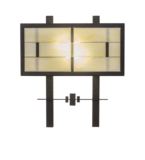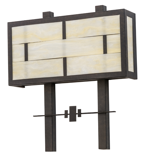 This handsome wall sconce features panels of Botticino Idalight that reveal an exquisite woven look while delivering beautiful ambient light. Straight line designs, decorative accents and a twin bar wall frame are featured in a handsome Chestnut finish. This American-made fixture is powered by two G24 CFL lamps for energy savings, reduced maintenance and long lamp life. Custom designs, colors and sizes are available, as well as dimmable lamping options. The fixture is UL and cUL listed for damp and dry locations.