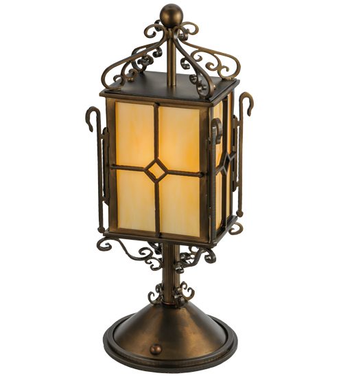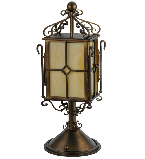 Ornate Hand-forged metalwork combined with soft ambient illumination create a rich, luxurious look for Standford. This high-styled tabletop lantern features a stunning Beige Glass lens, which is enhanced with diamond designs and scrolled accents in an Antique Copper finish. This unique lamp is ideal to complement a variety of architectural styles for today’s interiors. Handcrafted by master artisans in our 180,000 square foot manufacturing facility in Yorkville, New York. Diffuser colors, metal finishes and sizes can be customized to meet your needs. UL and cUL listed for dry locations.