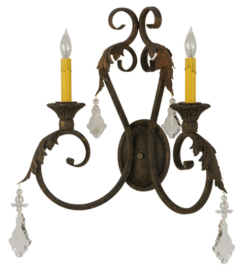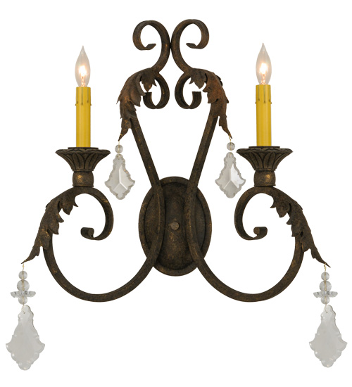 Offering luxurious charm and elegance, Josephine features an elegant chandelier design with Hand-forged scrolled arms and Acanthus leaf accents in a stunning Autumn Leaf finish. The exquisite wall sconce features 2 Ivory faux candlelights perched on decorative bobeches for beautiful ambient illumination and accented with arrays of Crystal pendalogues. Custom crafted in the USA, this lovely fixture is available in custom sizes, styles and colors, as well as dimmable energy efficient lamping options such as LED. The 18-inch wide wall fixture is UL and cUL listed for dry and damp locations.