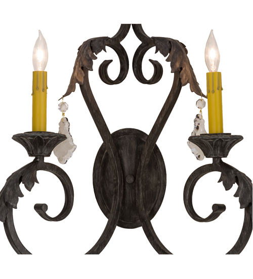 Offering luxurious charm and elegance, Josephine features an exquisite wall sconce design with Hand-forged scrolled arms and Acanthus leaf accents in an Antique Iron Gate finish. The elegant wall fixture reveals two Amber faux candlelights which are perched on decorative bobeches for beautiful ambient illumination and complemented with Crystal Pendalogues. Custom crafted in the USA, this lovely fixture is available in custom sizes, styles and colors, as well as dimmable energy efficient lamping options such as LED. The sconce is UL and cUL listed for dry and damp locations.