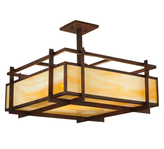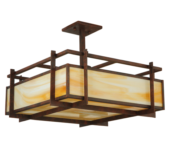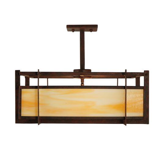 An avant-garde modern design that is warm and inviting. Boulder Creek offers a balanced architectural structure that will add drama and sophistication to any room. This Beige art glass diffuser is encased with a solid framework in a Rusty Nail finish. The fixture is handcrafted in our 180,000 square foot manufacturing facility in Yorkville, New York. Custom options include special sizes, diffuser colors and finishes. The pendant is UL and cUL listed for damp and dry locations.
