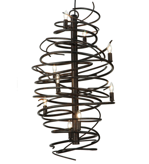 The bold, eye-catching Cyclone simulates whirling winds of energy and gyration with twisting steel that is accentuated with 9 delicately placed beacons to help you weather the storm. The winding mass of steel surrounds a sturdy post, all featured in our Coffee Bean finish. Make an impressive design statement that will wow guests in lobbies, conference rooms, entryways and other residential and commercial spaces. The fixture is handcrafted by master artisans in our Upstate New York manufacturing facility. Custom designs, styles, sizes and dimmable energy efficient lamping such as LEDs are available. This chandelier is UL and cUL listed for damp and dry locations.