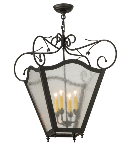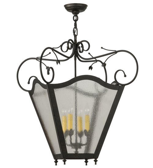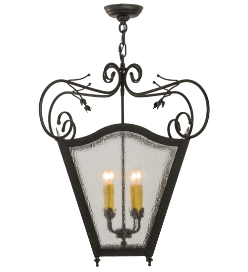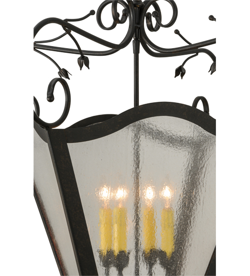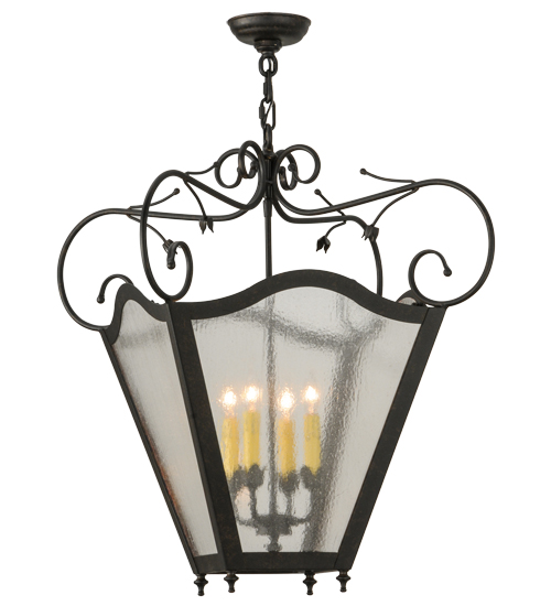 Expert craftsmanship comes to life with a stunning classic lantern design that entices. The exquisite Clear Seeded Glass pendant features a four-light faux candelabrum which illuminates from within and is enhanced with a frame and hardware offered in a Chestnut Textured finish. The fixture is custom crafted in the USA. Custom styles, designs, colors and dimmable energy efficient lamping options are available. The 28.5-inch wide pendant is UL and cUL listed for dry and damp locations.