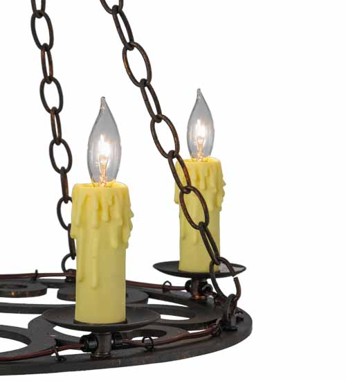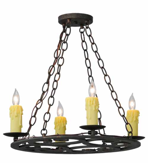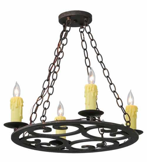 Gracefully and elegantly designed as a centerpiece for nearly any space, the distinctive Ashley chandelier features an exquisite decorative ring with fanciful scroll designs. Perched on bobeches above the ring are 4 delicate Ivory faux candlelights which provide beautiful ambient illumination. The decorative accents, frame and hardware are featured in a Copper Rust finish. Made in the USA, this chandelier is available in custom designs, colors, sizes and dimmable energy efficient lamping. The fixture, nearly 21 inches wide, is UL and cUL listed for damp and dry locations.