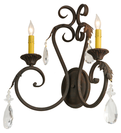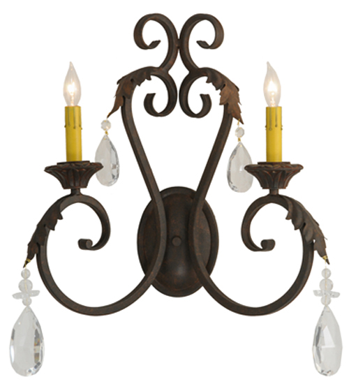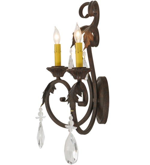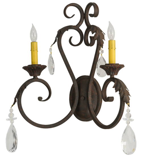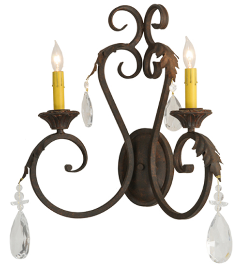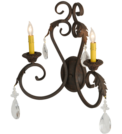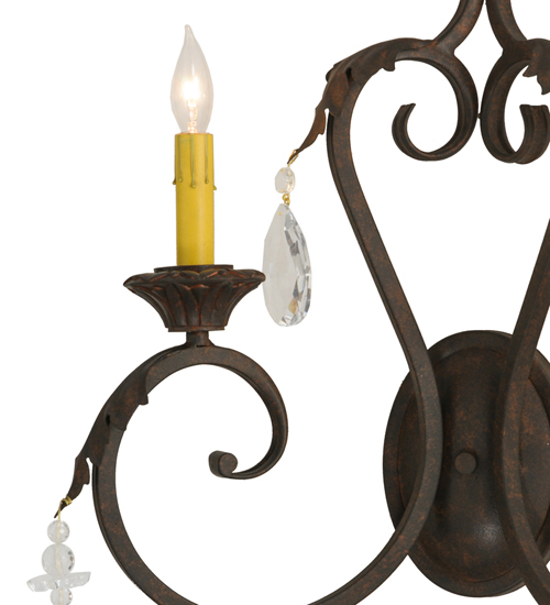 Offering a luxurious charm and elegance. Josephine features an elaborate design with Hand-Forged Iron scrollwork and accents in a stunning Cajun Spice finish. The exquisite wall sconce reveals 2 Ivory faux candlelights perched on bobeches, and is adorned with metal acanthus leaves and crystal pendalogues. Custom crafted by highly skilled artisans in our 180,000 square foot manufacturing facility in Yorkville, New York. Custom sizes, shade colors and metal finishes available. UL and cUL listed for dry and damp locations.