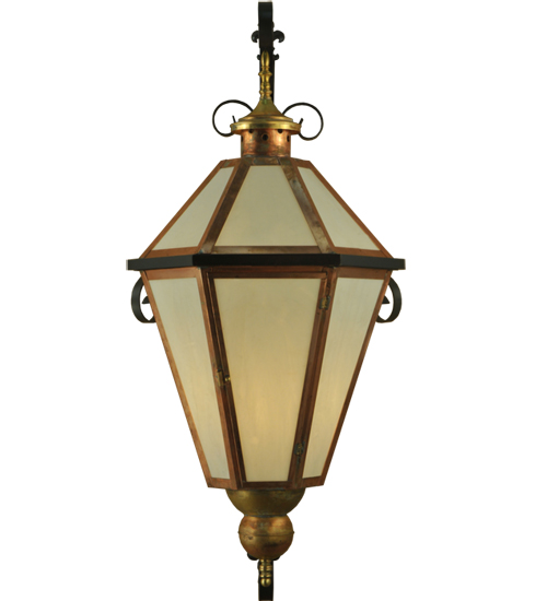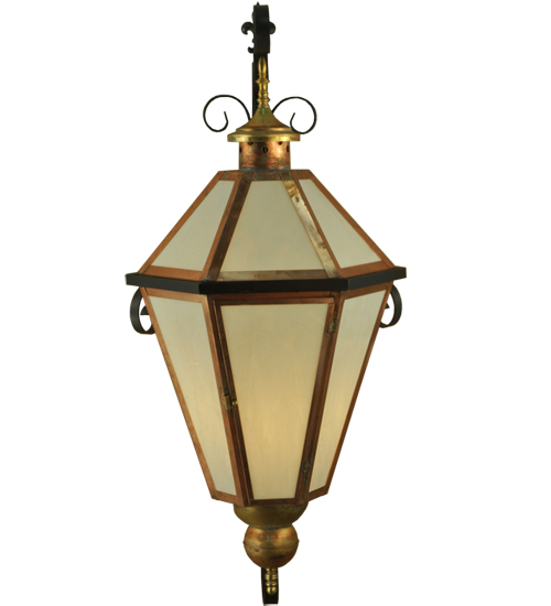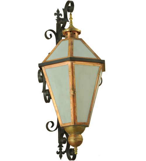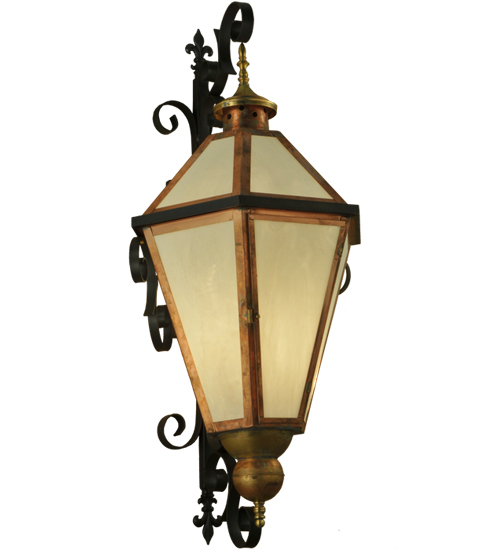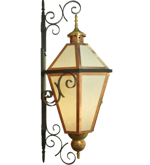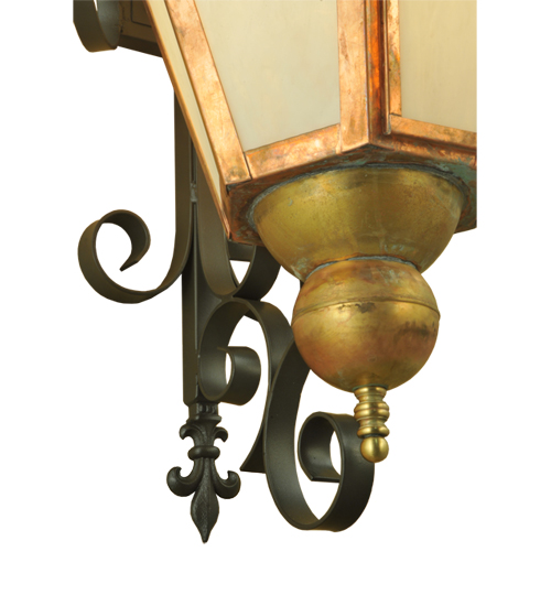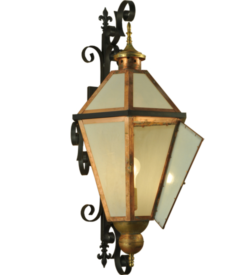 Grand stature and exquisite metalwork are combined to create a sophisticated, luxurious look for Millesime. This high-styled wall fixture features White Glass with a Satin finish, which is enhanced with a Brass and Copper lantern and complemented with a scrolled backplate. This sconce is ideal to complement a variety of architectural styles for today’s fine exteriors and interiors, including hallways, foyers, entryways and other spaces in residential, hospitality and other commercial settings. Custom crafted in the USA, this fixture is offered in custom sizes, finishes, styles and energy efficient lamping options. The 43-inch tall sconce is UL and cUL listed for dry, damp and wet locations.
