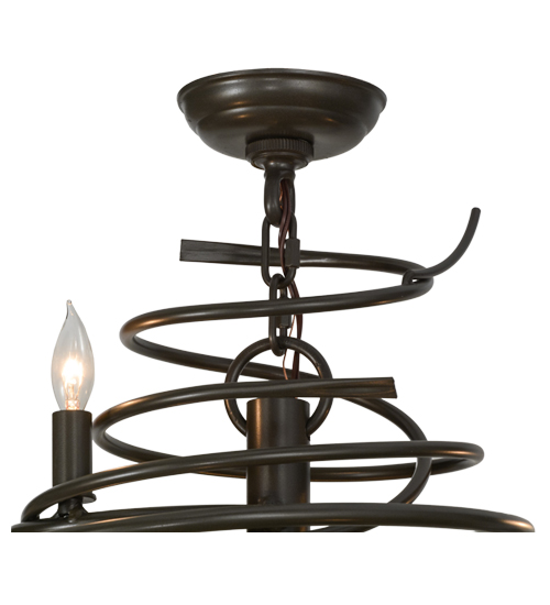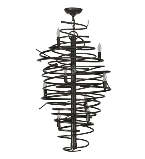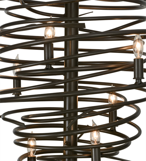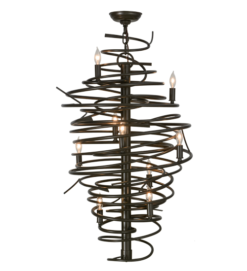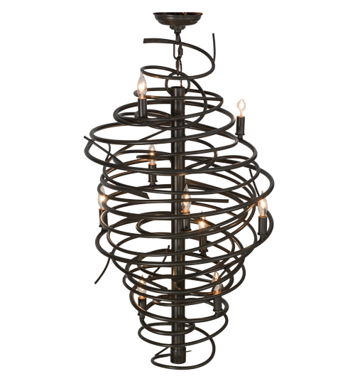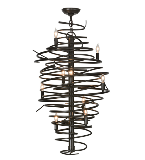 The bold, eye-catching Cyclone simulates whirling winds of energy and gyration with twisting steel that is accentuated with 9 delicately placed beacons to help you weather the storm. The winding mass of steel surrounds a sturdy post, all featured in our Timeless Bronze finish. Make an impressive design statement that will wow guests in lobbies, conference rooms, entryways and other residential and commercial spaces. The fixture is handcrafted by master artisans in our 180,000 square foot manufacturing facility in Yorkville, New York. Custom designs, styles, sizes and dimmable energy efficient lamping such as LEDs are available. This chandelier is UL and cUL listed for damp and dry locations.