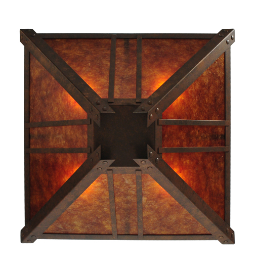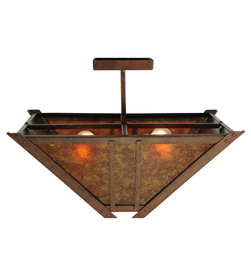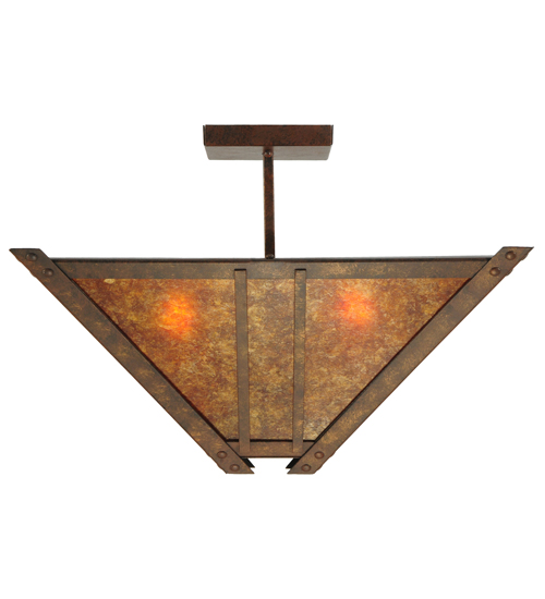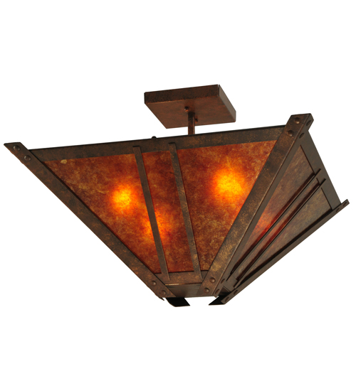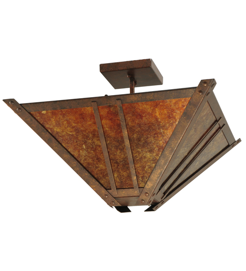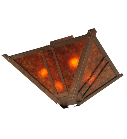 Evocative of the Craftsman period. This handsome ceiling fixture adds warmth and authentic appeal to interior spaces while creating a visually pleasing experience with welcoming ambient light. Stunning Amber Mica is complemented with a a Mission styled straight line design. The shade is enhanced with decorative accents and hardware featured in a Hanna Copper finish. Custom crafted in our 180,000 square foot manufacturing facility in Yorkville, New York. Lens colors, metal finishes and fixture sizes can be customized to your needs. UL and cUL listed for dry and damp locations.