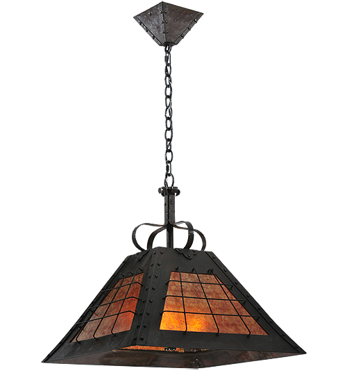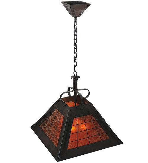 Like a hanging light right out of a Charles Dickens novel, this handsome pendant features a thin steel geometric design which encases stunning Amber Mica. The shade, which produces beautiful ambient light, is enhanced with decorative accents and hardware featured in a bold Costello Black finish. Handcrafted in the USA, this fixture is available in custom sizes, styles, colors and dimmable energy efficient lamping options. The fixture is UL and cUL listed for dry and damp locations.