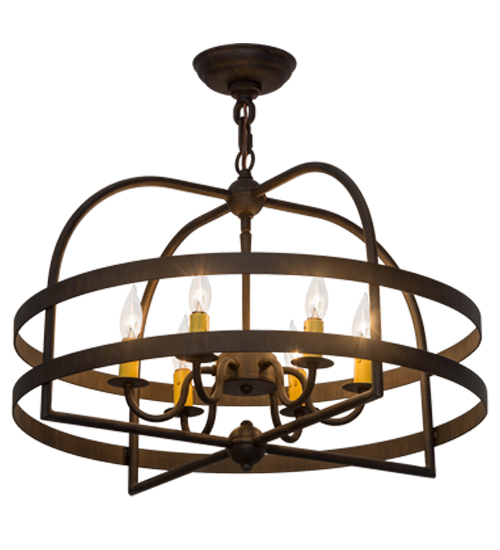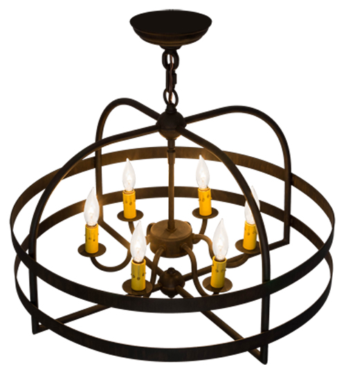 Combining a classic look with industrial styling. The Aldari chandelier features 6 Amber faux candlelights which provide beautiful ambient lighting from within. A sturdy geometric frame is encircled by two rugged decorative rings for a unique look. The hardware is featured in a Classic Rust finish. The overall height of this chandelier ranges from 20.5 to 31 inches and the chain length can be easily adjusted in the field to accommodate your specific lighting application needs. This fixture is ideal for illuminating foyers, living spaces and a variety of other rooms in residential and commercial settings. Custom crafted by highly skilled artisans in our 180,000 square foot manufacturing facility in Yorkville, New York. UL and cUL listed for damp and dry locations.