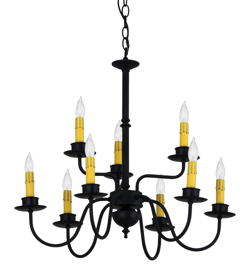 Sophisticated elegance and delicate grace epitomize the Ean Chandelier. The Blackwash finished frame with hardware embraces 9 Ivory faux candlelights perched on bobeches. Decorative bottom finial and accents are also featured in Blackwash. The 22-inch wide fixture is handcrafted by highly skilled artisans in Yorkville, NY. Custom sizes, colors and finishes are available, as well as dimmable energy efficient lamping options such as LED. The 22-inch wide chandelier is UL and cUL listed for dry and damp locations.
