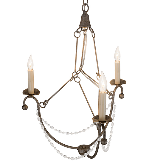 Designed with a new twist on old world styling, Kaitlynn drapes delicate garlands of crystal beads as 3 Ivory faux candlelights are perched on Lily pad-like bobeches embraced by curved arms which are complemented with scroll-like accents from above. All hardware is featured in a hand-applied Corinth finish. Custom options includes special sizes, finishes, styles and dimmable energy efficient lamping such as LED. The chandelier is UL and cUL listed for dry and damp locations.