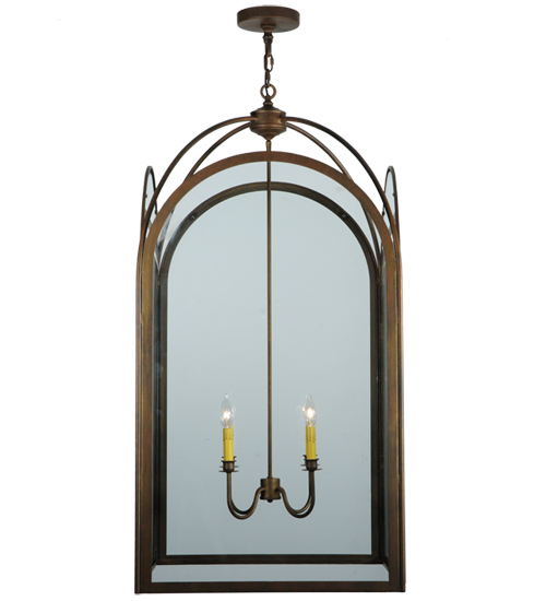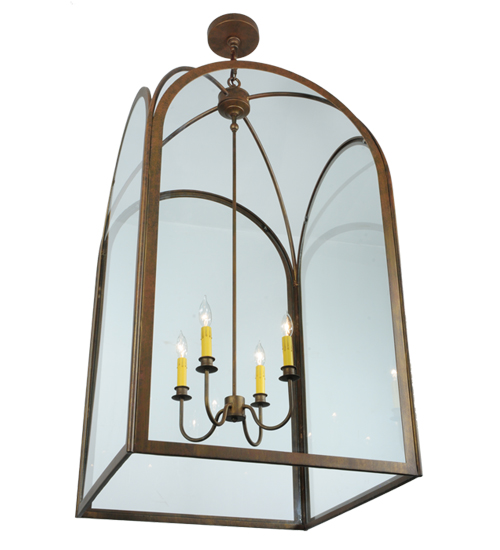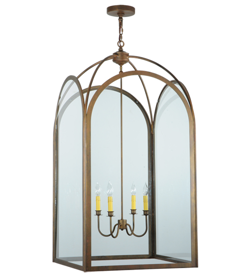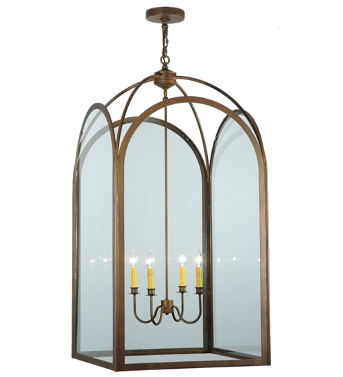 Inspired by the arched profile of windows found in landmark cathedrals and majestic castles. The luxurious Perin features Clear Glass panels that reveal 4 Amber faux candlelights delivering beautiful ambient illumination. The gracefully styled pendant is offered in a Cortez Gold finish. The overall height ranges from 53 to 100 inches as the chain length can be easily adjusted in the field to accommodate your specific lighting needs. Shade colors, metal finishes and fixture sizes can be customized to your needs. UL and cUL listed for dry and damp locations.