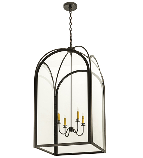 Inspired by the arched profile of windows found in landmark cathedrals and majestic castles, the luxurious Perin features Crystal Idalight panels that reveal an Amber four-light faux candelabra. The gracefully styled frame and hardware are offered in a warm Oil Rubbed Bronze finish. Handcrafted in Yorkville, New York, the 24.5 inch wide pendant is available in custom sizes, styles and finishes. Dimmable energy efficient lamping options such as LED are offered. The elegant fixture is UL and cUL listed for dry and damp locations.