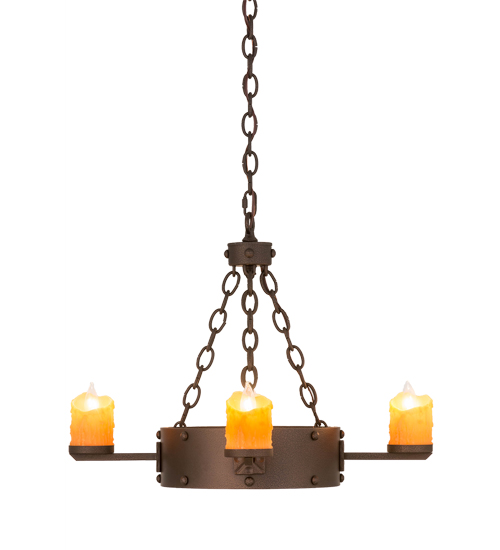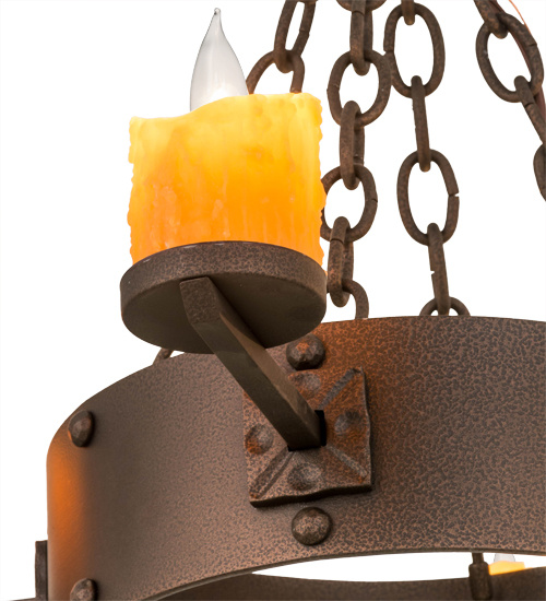 Welcome Gothic Revival into your home or business with the stunning Kingston Chandelier, which integrates a rustic motif with distinctive styling. 8 Amber faux candles perched atop holders on a solid steel decorative ring provide beautiful ambient lighting that conjures up images of romanticized days. Decorated with medallions and featured in a Matte Copper Vein finish, the chandelier is custom crafted in Yorkville, New York by artisans. The fixture is available in custom sizes, styles and colors, as well as dimmable energy efficient lamping options such as LED. Kingston is UL and cUL listed for damp and dry locations.