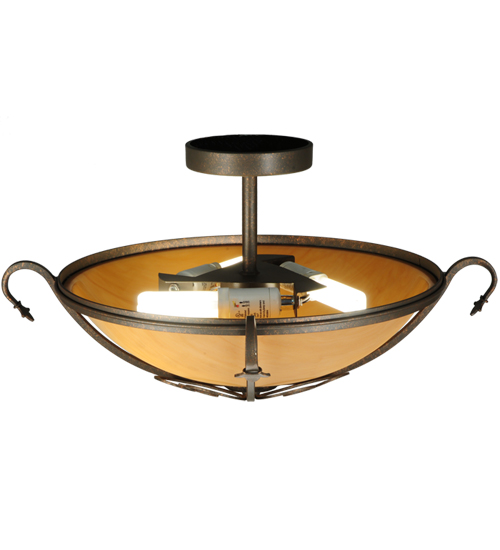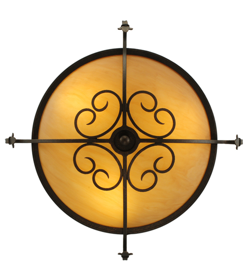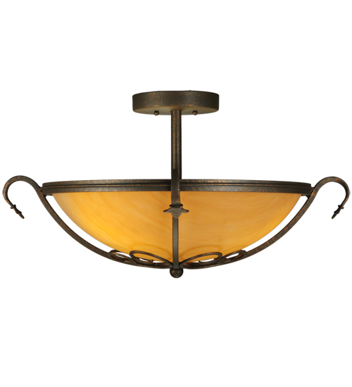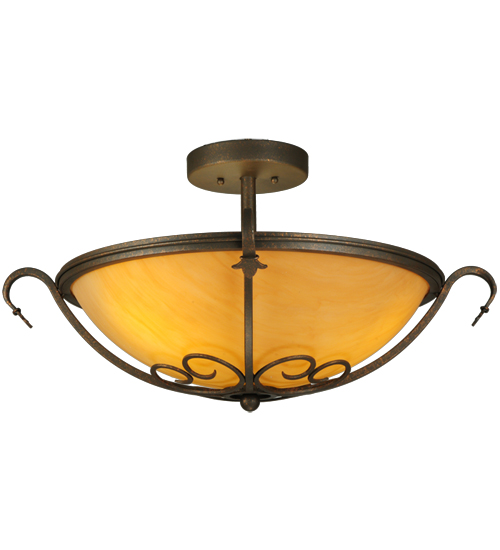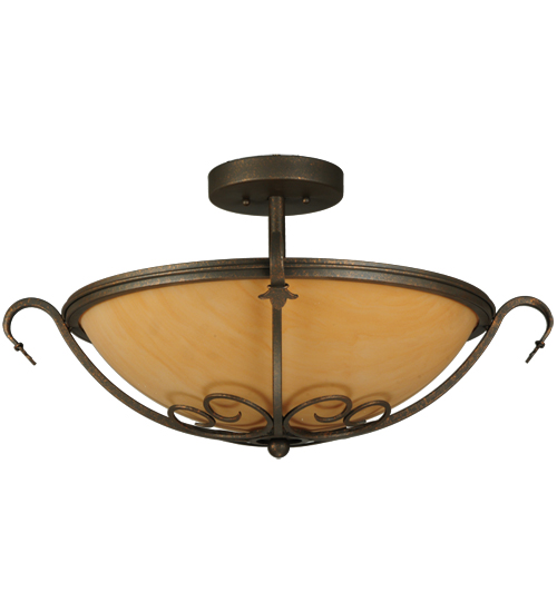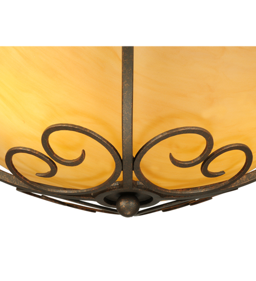A stunning Amber Quartz Idalight diffuser is graced with Hand-Forged Iron Scrollwork on the Alaine ceiling fixture. This elegant shade is enhanced with a Gilded Tobacco finish. 3 Customer supplied G24Q-1 base compact fluorescent lamps (CFLs) provide energy efficient illumination. Custom crafted by highly skilled artisans in our 180,000 square foot manufacturing facility in Yorkville, New York. Shade colors, metal finishes and fixture sizes can be customized to your needs. UL and cUL listed for dry and damp locations.