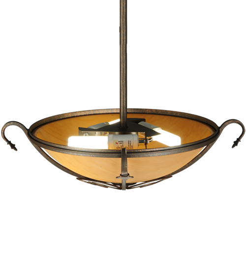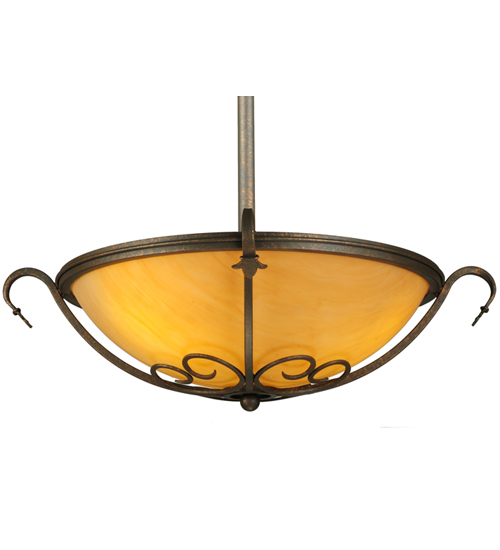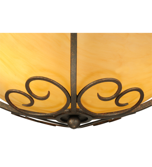 A stunning Amber Quartz Idalight diffuser is graced with Hand-Forged Iron Scrollwork on the Alaine pendant. The elegant shade is enhanced with a Gilded Tobacco finish. 3 Customer supplied G24Q-1 base compact fluorescent lamps (CFLs) provide energy efficient illumination. Custom crafted by highly skilled artisans in our 180,000 square foot manufacturing facility in Yorkville, New York.Shade colors, metal finishes and fixture sizes can be customized to your needs. UL and cUL listed for dry and damp locations.