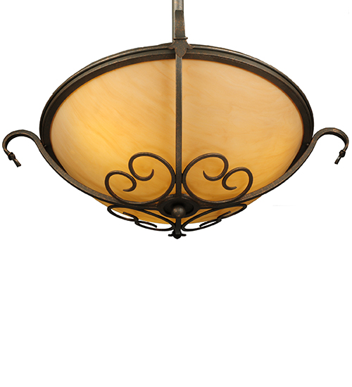 A stunning Amber Quartz Idalight diffuser is graced with Hand-Forged Iron Scrollwork on the Alaine pendant. The elegant shade is enhanced with a Gilded Tobacco finish. 3 Customer supplied G24Q-1 base compact fluorescent lamps (CFLs) provide energy efficient illumination. Custom crafted by highly skilled artisans in our 180,000 square foot manufacturing facility in Yorkville, New York.Shade colors, metal finishes and fixture sizes can be customized to your needs. UL and cUL listed for dry and damp locations.