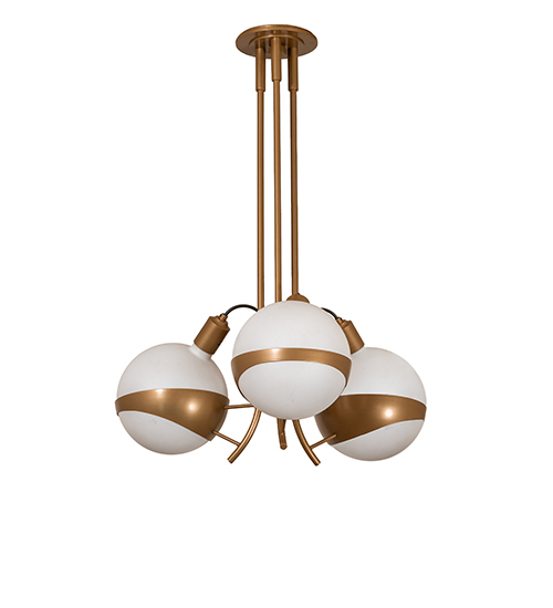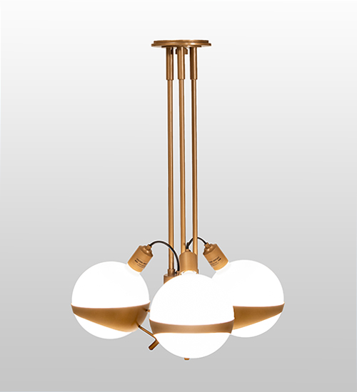Seductive and modern. The Bola Tankini Pendant creates dramatic visual interest with sophistication, romance, and elegance. This exquisite pendant is highlighted with three orb diffusers featuring Honey Bucket finished Deco-style accents in the center of each. Each element is illuminated by a customer-supplied Sphere V lamp, a large light source in an orb form factor that provides dim-to-warm illumination for the changing moods of a modern hospitality environment. The Bola Tankini 3 Light Pendant is featured in our American-made, American-designed, handcrafted Art Deco Lighting Collection. UL and cUL listed for dry and damp locations. This fixture was designed by David Singer of Arc Light Design in New York and is Featured at the Wolfgang Puck Bar & Grill in the MGM Grand Hotel & Casino in Las Vegas.