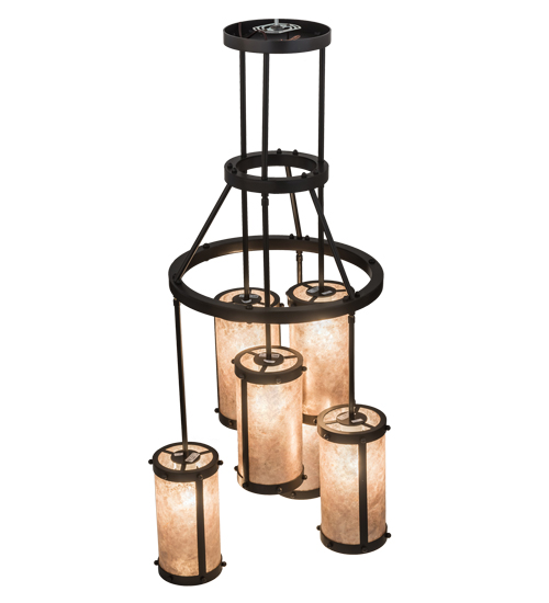 The Cartier Cascading chandelier renders an eye-catching transitional look. Six handsome Silver Mica shades are aligned in a staggered formation, suspended from two decorative rings and a canopy while providing ambient light at various levels. All hardware is hand finished in Costello Black, while a warm glow evokes from decorative cylinders. Ideal for illuminating lobbies, foyers, ballrooms, and large spaces. Custom crafted in our Upstate New York manufacturing facilities. Custom options include special sizes, styles, finishes, and dimmable energy-efficient lamping options. UL and cUL listed for dry and damp locations.