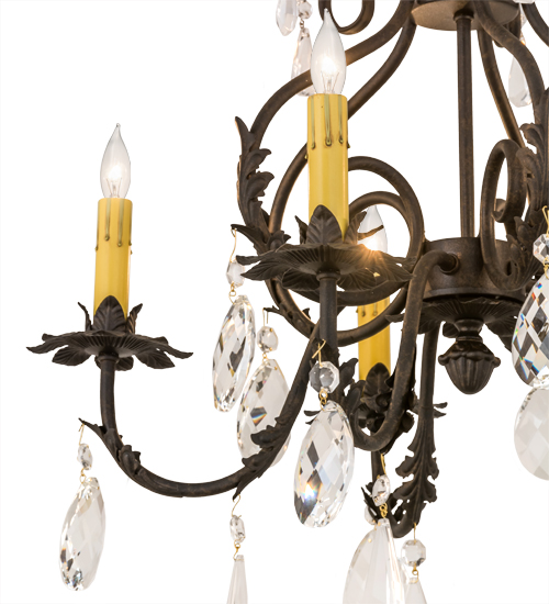 An elegant chandelier design comes to light with sparkle and glamour. 5 Amber faux candlelights are perched on floral bobeches which are embraced by exquisite curved arms featured in a Chestnut finish. Matching Acanthus leaves, crystal droplets and scrolls grace this lovely fixture. The overall height ranges from 26 to 74 inches as the chain length can be easily adjusted in the field to accommodate your specific lighting application needs. Handcrafted in our 180,000 square foot manufacturing facility in Yorkville, New York. Custom options include special sizes, diffuser colors and finishes. UL and cUL listed for damp and dry locations.