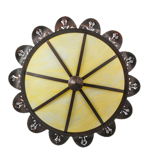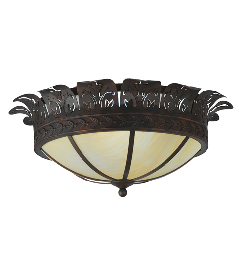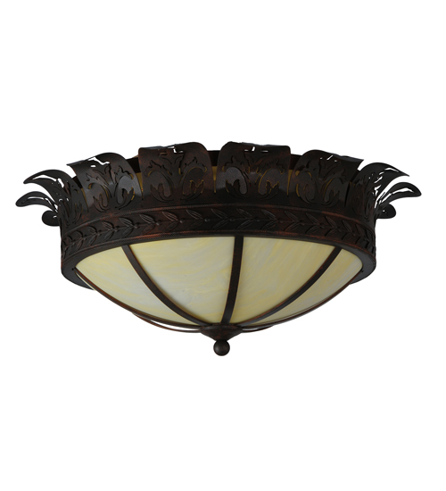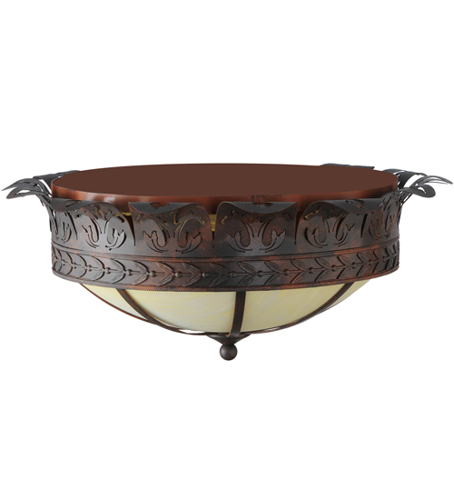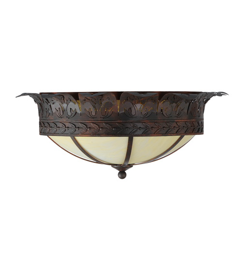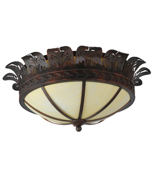This lovely ceiling fixture features an elegant crown with metal cutouts representing Acanthus Leaf accents. A stunning banding of Leaves and Berries in a Cajun Spice finish circles the perimeter of the beautiful Botticino Idalight shade. This ceiling fixture can be placed in dining and kitchen spaces in fine homes and hotels from Shelter Island, New York, to Columbus, Ohio, to Palm Springs, California. This item includes a compact fluorescent lamp (CFL), but refer to model 246051 for standard lamping. The Crowne Flushmount is included in our American-made, American-designed, handcrafted Nature Inspired Collection, which is manufactured in Yorkville, New York. UL and cUL listed for dry and damp locations.